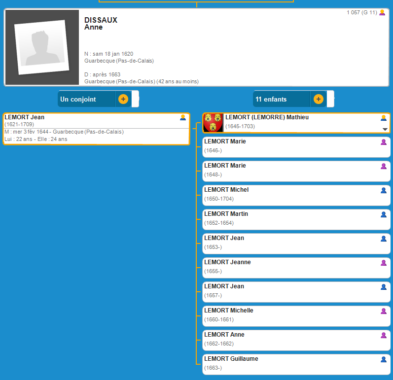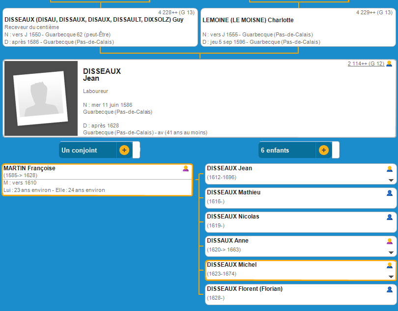 a Descendance Michel DISSEAUX Via DELMARE (G7-7), LEMORT(G6-4) Puis DUPONCHEL