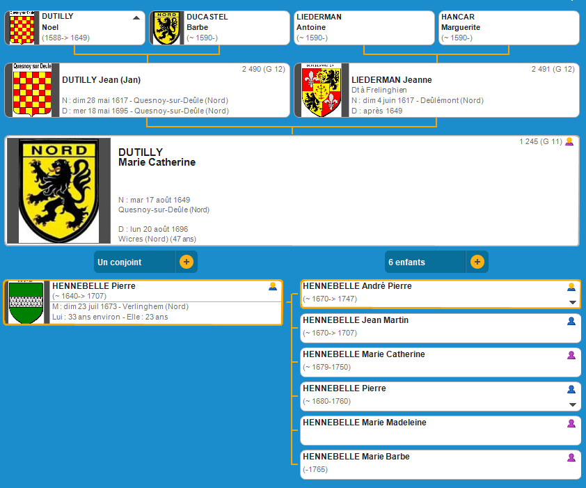 La Descendance De Marie Catherine DUTILLY Via HENNEBELLE(G9-37), ROUZE(8-18), CREPIN (G7-9), LEROY(G5-3), WILLIART(G4-1) Puis DUPONCHEL