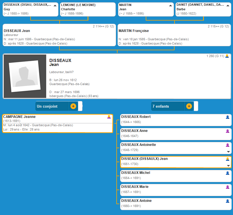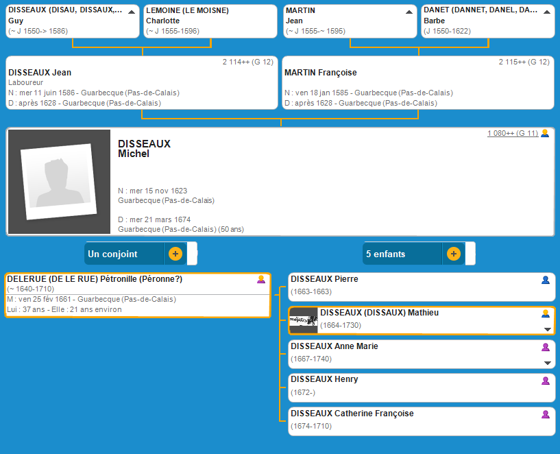 a Descendance Michel DISSEAUX Via DELMARE (G7-7), LEMORT(G6-4) Puis DUPONCHEL