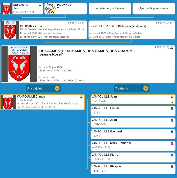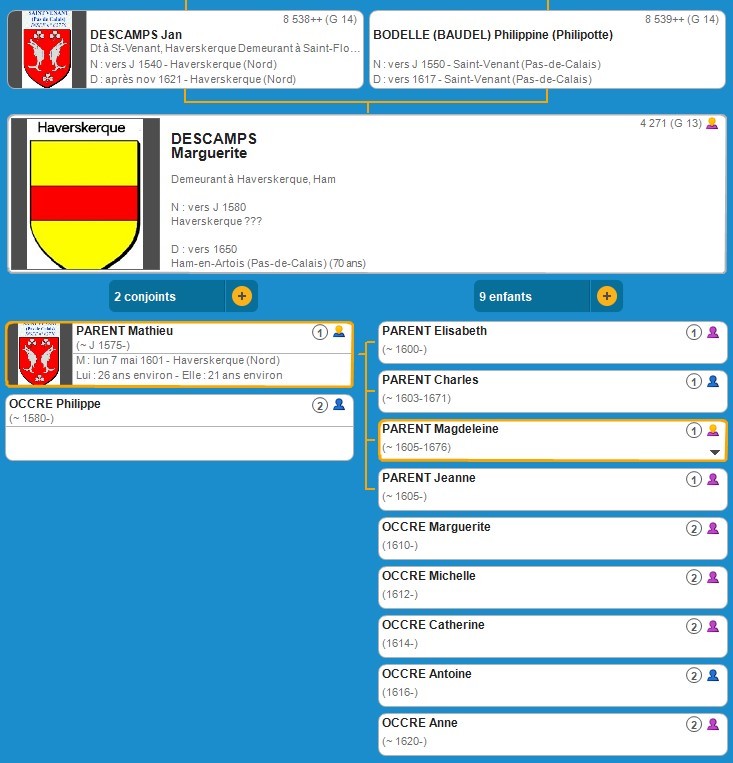 Descendance Marguerite DESCAMPS Via PARENT (G12-18), VANPOUILLE (G11-14), BAUDELLE(G10-10), MARTEL (G10-25), LEMORT(G6-04), Et DUPONCHEL