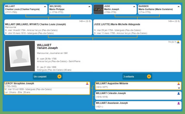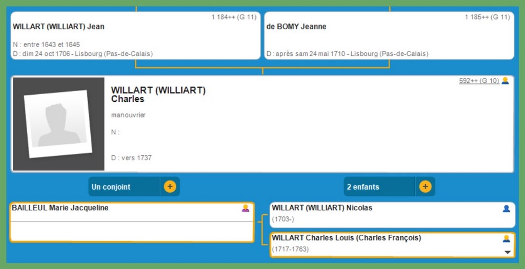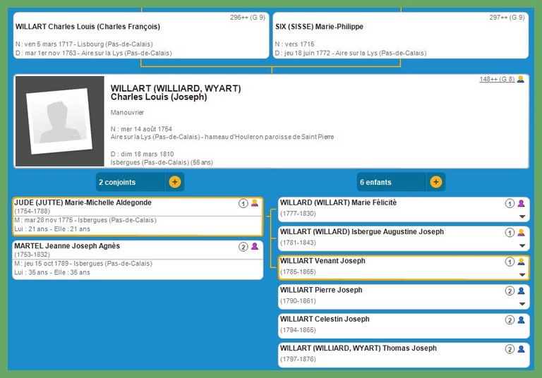 Mes WILLIART sont originaires du Pas-de-Calais. C'est un nom peu populaire en France. Le nom est surtout porté dans le Nord-Pas-de-Calais et dans l'Oise, tout comme ses variantes Williart, Willard, Willart, Williate, Williatte, Willatte. C'est un nom de personne d'origine germanique, Willihard (will = volonté + hard = dur). Forme flamande : Willaert.