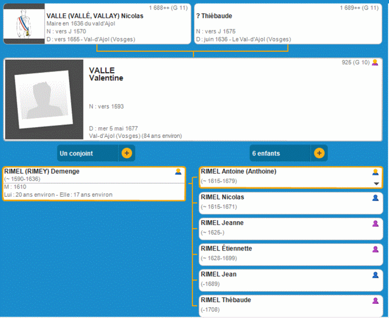 La Descendance VALLE Valentine Via RIMEL, DESCHAMBENOIT, HUGUET, MENIGOZ, BRINGOUX Et GOYER